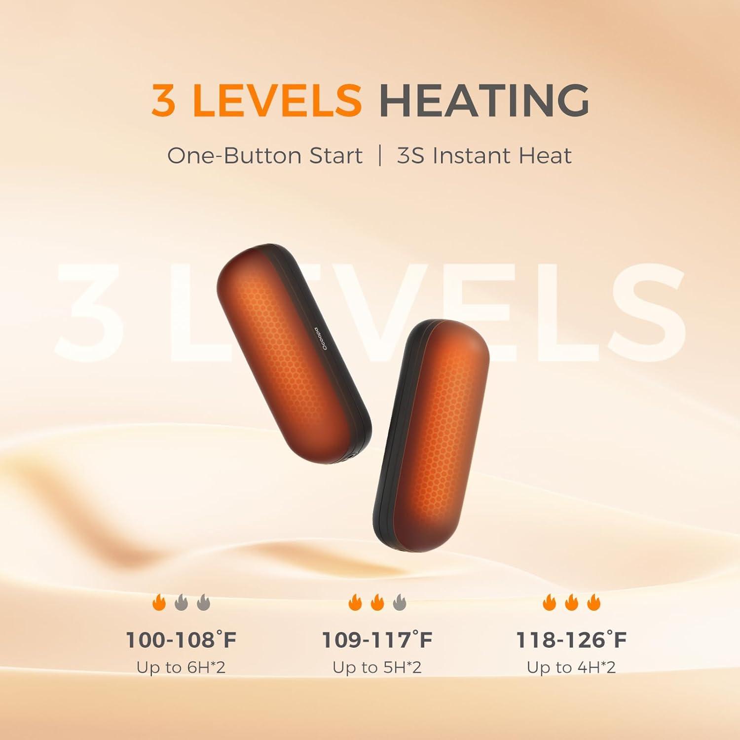 Experience instant heat at your fingertips! With just a 3-second warm-up time, these hand warmers provide rapid relief from the cold. Plus, they offer three heating levels that you can easily adjust with a single button press. Our hand warmers are UL certified for safety and designed with your skin's comfort in mind, so you can enjoy warmth without irritation.