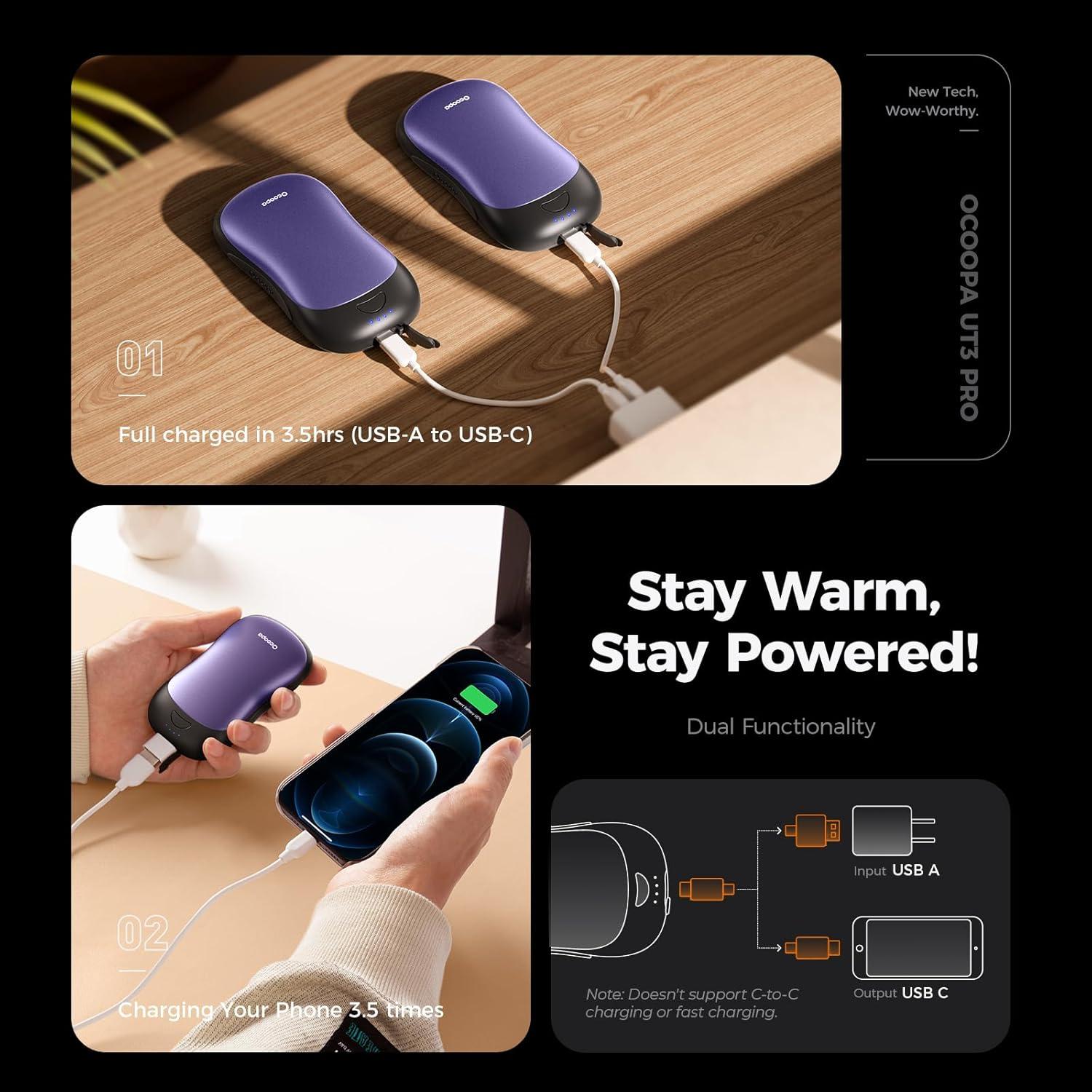 Power That Lasts All Day: Equipped with dual 5000mAh batteries, UT3 Pro keeps your hands warm for up to 8 hours on low setting—plenty for full shifts, outdoor adventures, or all-day events. Heats 40% more surface area than standard warmers, and doubles as a power bank that can charge your phone up to 3.5 times.