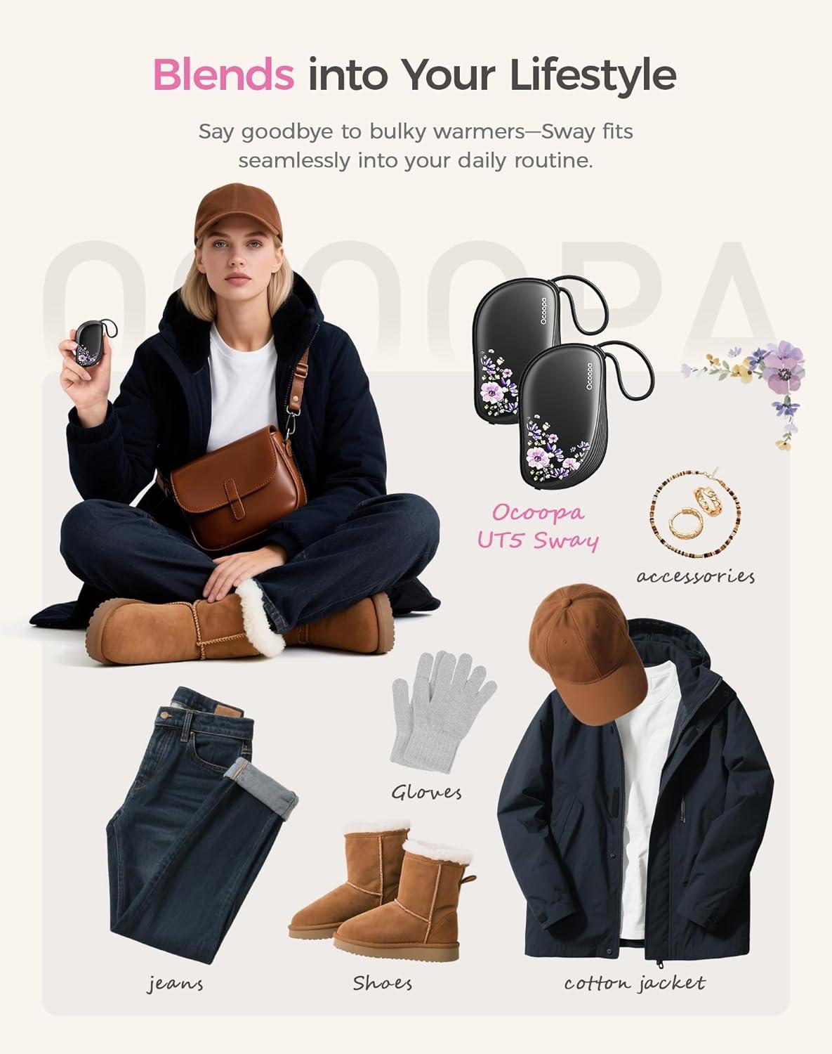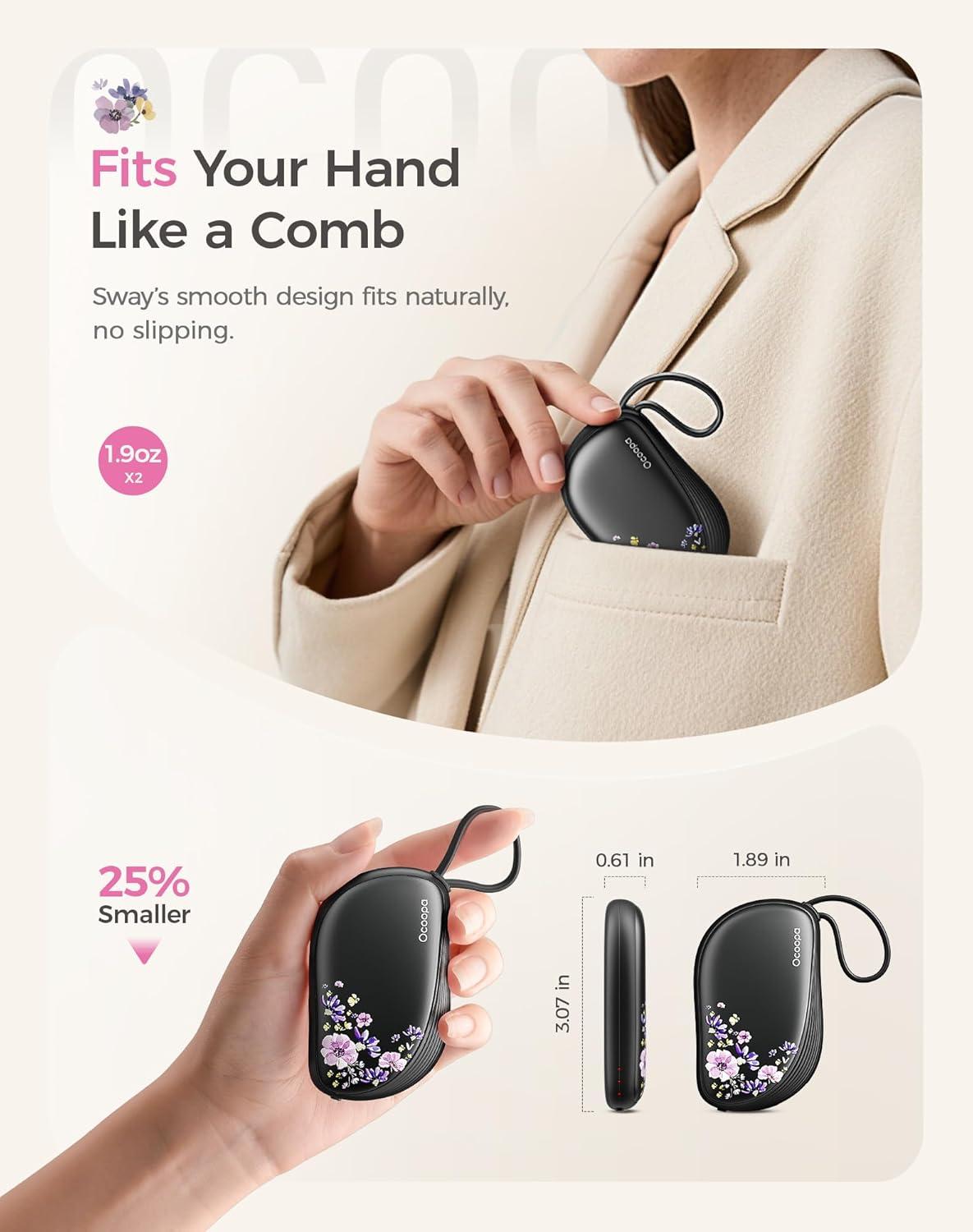 Inspired by the Comb, Built for Warmth: Inspired by the graceful curves of a royal comb, the UT5 Sway hand warmers blend timeless design with modern heating technology. Heats up in just 3 seconds and delivers steady, single-sided warmth for up to 6 hours with three heat levels. No more bulky or disposable warmers—just compact comfort that goes where you go.