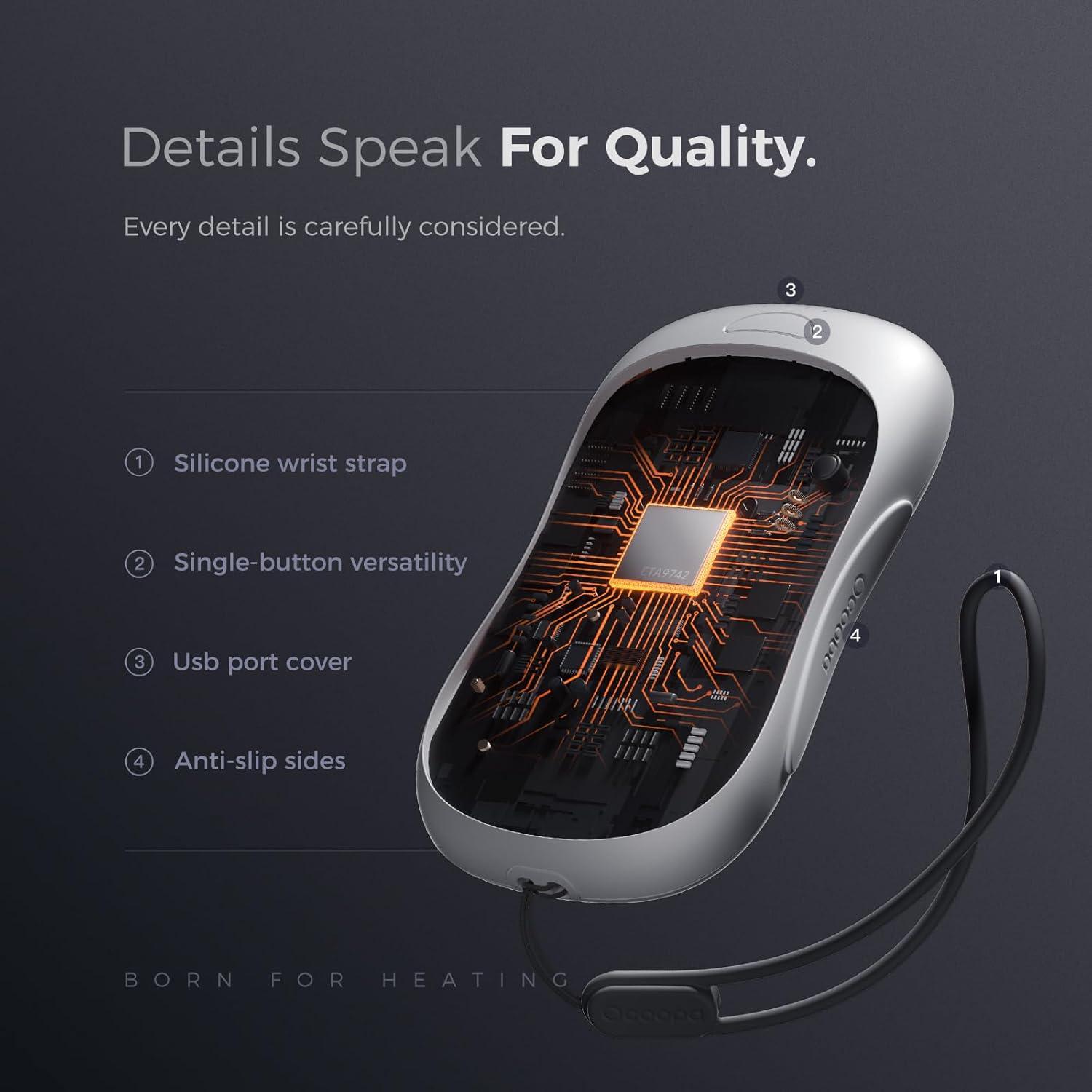 Longer Lasting Warmth: With an enhanced 5000mAh x2 rechargeable battery capacity and performance, enjoy 6-15 hours of continuous heat, ideal for all-day outdoor activities. This handwarmer also functions as a power bank, capable of charging your phone over 3.5 times.